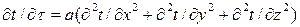 где Q – количество теплоты, Дж; F – площадь поверхности, м²; τ – время, с; λ – коэффициент теплопроводности, Вт/(м·К). Коэффициент теплопроводности есть физический параметр вещества, числовое значение которого равно количеству теплоты, проходящей через единицу изотермной поверхности (1 м²) в единицу времени (1 сек) и когда градиент температуры равен единице. Коэффициент теплопроводности зависит от температуры, давления, влажности и рода вещества. Коэффициент температуропроводности объединяет три физических параметра λ, с, ρ; а= λ/(с·ρ) Дифференциальное уравнение теплопроводности в общем случае (трехмерное температурное поле) без внутренних источников тепла имеет вид: