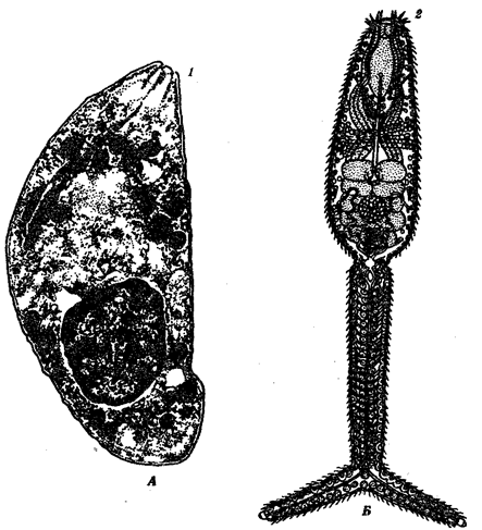 Рис. 18.7. Приспособления, служащие для проникновения в организм хозяина. А— простейшее токсоплазма; Б — церкарии — личинка кровяного сосальщика: 1 — коноид, 2 — колющие стилеты