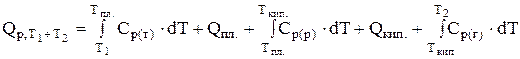 де Qр,пл. – теплота плавлення, Дж/кг. У випадках, коли в інтервалі температур Т1¸Т2 має місце фазове перетворення (плавлення, кипіння), треба користуватися в розрахунках рівняннями (2.14-2.15), в яких всі можливі в цьому інтервалі температур фазові перетворення враховані. При обчисленні теплоти нагрівання за рівнянням (2.13) необхідно врахувати теплоту фазового перетворення і зміну коефіцієнтів емпіричного ступеневого ряду зі зміною агрегатного стану речовин. Рівняння (2.13) у цьому разі має вигляд