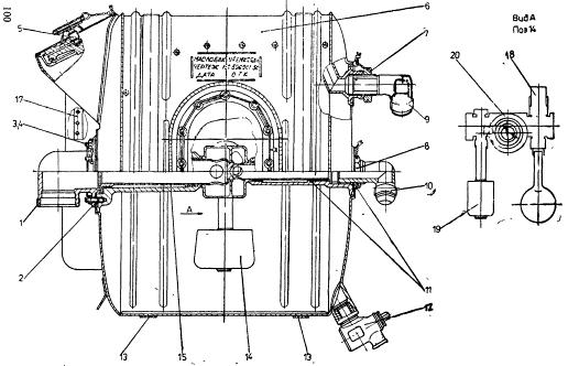 1 - Угольник; 2 - Прокладка; 3 - Гайка; 4 - Шайба; 5 - Крышка заливной горловины; 6 - Бак; 7, 8 - Контргайка; 9, 10 - Штуцера; 11 - Кольца; 12 - Сливной кран; 13 - Прокладка; 14 - Заборник; 15 - Ось, 16 - Заглушка, 17 - Масломер; 18 - Заборник воздуха; 19 - заборник масла, 20 - кopпуc.