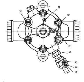 Бензонасос 702МЛ (рис. 1) состоит из качающего узла коловратного типа, узла редукционного клапана с заливочным клапаном и деталей уплотнения. В конструкцию качающего узла насоса входят: корпус (33), ротор (20), четыре пластины (37), стакан (19), плавающий палец (36), подпятники (21) и (18). Пластины (37) качающего узла расположены в пазах ротора (20) и опираются одной стороной на плавающий палец (36), а другой - на внутреннюю поверхность стакана (19). Ротор своими цапфами опирается на подпятники (21) и (18). Качающий узел смонтирован в цилиндрической расточке корпуса (33). Положение качающего узла фиксируется штифтом (9). Корпус (33) насоса имеет два фланца: один для крепления насоса к двигателю, другой для крепления к корпусу (7) редукционной камеры. Сальниковое уплотнение, расположенное в цилиндрической расточке корпуса (33), предотвращает попадание бензина из полости качающего узла в привод двигателя и масла из полости привода в качающий узел насоса. Для контроля течи бензина и масла через сальниковое уплотнение в корпусе (33) имеются два отверстия с конической резьбой, в одно из которых ввернут дренажный штуцер. Для присоединения к двигателю фланец корпуса (33) имеет четыре прилива с отверстиями и центрирующий бурт. В конструкцию узла редукционного клапана входят корпус (7) редукционной камеры, крышка (26), детали редукционного клапана (6), заливочный клапан (23) с пружиной (22). Корпус (7) редукционной камеры имеет два фланца: один с центрирующим буртом для соединения с корпусом (33) качающего узла насоса, другой для соединения с крышкой (26) редукционной камеры. Для присоединения к корпусу (33) и крышке (26) на корпусе (7) редукционной камеры имеются четыре отверстия диаметром 5,3 мм и два отверстия с резьбой. На внутренней полости корпуса редукционной камеры расположены два литых канала для входа и выхода бензина. Внутри корпуса расположены узел редукционного клапана (6) и заливочный клапан (23) с пружиной. Крышка (26) редукционной камеры крепится к корпусу (7) и к корпусу (33) насоса шестью винтами (24), (38) и (40). На крышке (26) выполнена бобышка с наружной резьбой для колпачка (29) и внутренней резьбой под регулировочный винт (28) и бобышка с отверстием для сообщения с атмосферой. Между плоскостями крышки и корпуса редукционной камеры установлена мембрана (25) узла редукционного клапана. Узел редукционного клапана состоит из клапана (6) с закрепленной на нем с помощью гайки (I) мембраной (25) и пружины (27). Гайка (1) контрится замком (2). Пружина (27) одним концом упирается в гнездо штока клапана, а другим - в торец регулировочного винта (28). Редукционный клапан (6) конусной частью опирается на седло в корпусе (7) редукционной камеры, а цилиндрической направляющей с двумя декомпрессионными лысками входит в расточку корпуса редукционной камеры. Давление бензина в полости нагнетания регулируют изменением натяжения пружины (27) с помощью регулировочного винта и головки (30) регулировочного винта. При вращении головки по ходу часовой стрелки регулировочный винт (28) ввертывается в бобышку крышки (26) и сжимает пружину (27). При этом давление бензина повышается. При вращении головки против хода часовой стрелки пружина ослабляется. При этом давление бензина уменьшается. На цилиндрической направляющей редукционного клапана смонтировал заливочный клапан (23), служащий для заливки бензомагистрали перед запуском д