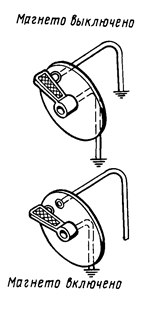 Зажигание смеси в цилиндрах осуществляется от искры тока высокого напряжения, образуемого в двух магнето, установленных на задней крышке. Ток высокого напряжения от магнето передается к свечам по проводникам высокого напряжения, заключенным в экранированный коллектор проводов зажигания. Оба магнето левого вращения. Правое магнето обслуживает задние свечи, левое - передние. Для воспламенения рабочей смеси в цилиндрах при запуске в систему зажигания включена пусковая катушка КП-4716. Ток от бортовой сети, проходя по первичной обмотке катушки КП-4716, намагничивает сердечник катушки, и разомкнутые до этого контакты прерывательного механизма пусковой катушки замыкают первичную обмотку катушки на "массу". Исчезающее вместе с током магнитное поле наводит во вторичной обмотке катушки высокое напряжение, необходимое для образования искры между электродами свечи. Высокое напряжение подается на пусковой электрод бегунка магнето и через электроды распределителя на свечи цилиндров. Когда двигатель развивает частоту вращения 12-14 % (300-400 об/мин), пилот включает магнето и выключает пусковую катушку КП-4716. В этом случае высокое напряжение со вторичной обмотки трансформатора магнето подается на рабочий электрод бегунка и затем через электроды распределителя - на свечи цилиндров. Включение и выключение магнето производятся с помощью переключателя, рукоятку которого можно устанавливать в четыре положения: "0" - оба магнето выключены; "1" - работает левое магнето, а правое выключено; "2" - работает правое магнето, а левое выключено; "1 +2" - работают оба магнето. Высоковольтная пусковая катушка КП-4716 соединена с пусковым электродом левого магнето. Схема зажигания показана на рис. I.