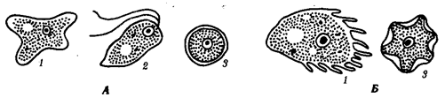 Рис. 19.12. Факультативные паразиты человека. А — Naegieria sp.; Б — Acanthamoeba sp.: 1, 2 — вегетативные стадии, 3 — цисты Амебы р. Naegieria в организм человека попадают при купании в грязной воде через носовую полость и проникают в мозговые оболочки. Здесь амебы размножаются и вызывают острый менингоэнцефалит, который почти всегда заканчивается смертью. Наиболее часто поражаются дети. Амебы р. Acanthamoeba образуют устойчивые цисты, которые попадают в организм человека не только через носоглотку и пищеварительную систему, но и при вдыхании, а также через травмированную кожу и роговицу. Заболевание проявляется по-разному в зависимости от путей попадания возбудителя в организм. Характерным является образование гранулем, содержащих амеб. У ослабленных больных и детей заболевание заканчивается менингоэнцефалитом и смертью.