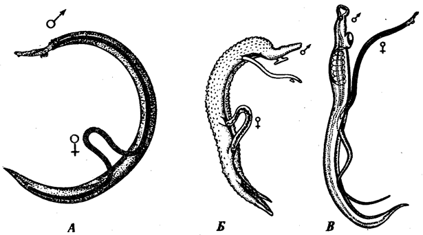 К этой группе относятся так называемые кровяные сосальщики — шистосомы. Это раздельнополые организмы. Самцы имеют широкое тело, а самки — шнуровидное и в половозрелом состоянии находятся в гинекофорном канале на брюшной стороне самцов. Присоски невелики и располагаются на переднем конце тела. Все кровяные сосальщики обитают в тропических широтах Азии, Африки и Америки. В связи с тем что половозрелые шистосомы живут в кровеносных сосудах, яйца, которые откладывают самки, имеют специальные приспособления для выведения в полостные органы и далее во внешнюю среду: они снабжены шипами, через которые выделяются ферменты, растворяющие ткани хозяина. За счет этих ферментов яйца пробуравливают стенки сосудов, проникают в ткани, могут попадать в кишечник или мочевой пузырь в зависимости от вида паразита. Опасным и характерным для этих паразитов является гематогенный занос яиц в различные органы, где вокруг них возникают локальные воспалительные процессы. Как и у всех сосальщиков, личиночные стадии, размножающиеся партеногенезом, развиваются в водных моллюсках. Характерными являются церкарии — они имеют раздвоенный хвост, а на переднем конце — железы проникновения, с помощью которых проникают через кожу в кровеносную систему окончательного хозяина при нахождении его в воде (см. рис. 18.7). При этом они вызывают кожные поражения — церкариозы, выражающиеся в появлении сыпи, зуде и других аллергических проявлениях. При массовом попадании церкарии в легкие возникает пневмония. Церкариозы могут вызываться не только шистосомами, паразитирующими у человека, но и несколькими видами кровяных сосальщиков, обитающих у водоплавающих птиц. Эти виды церкарии у человека обычно погибают либо в коже, либо в легких. Личинки шистосом, патогенных для человека, мигрируют по организму и оседают в венах брюшной полости и малого таза, где и достигают половой зрелости. Патогенное действие половозрелых шистосом выражается в токсико-аллергических реакциях хозяина и местных проявлениях: характерны кровотечения из пораженных органов, образование изъязвлений и полипов, склонных к злокачественному перерождению. Диагностика заключается в обнаружении яиц шистосом в фекалиях или моче. Проводят также аллергические внутрикожные пробы и иммунобиологические реакции в пробирке. Профилактика шистосоматозов: необходимо остерегаться длительных контактов с водой в зонах распространения этих паразитов. В связи с тем что церкарии могут проникать и через слизистые оболочки, для питья следует использовать только обеззараженную воду. В целях общественной профилактики необходима охрана водоемов от загрязнения необеззараженными сточными водами. В ряде случаев возможна также борьба с моллюсками — промежуточными хозяевами паразитов — разными способами. В Бразилии эффективным оказался метод биологической борьбы с шистосомами — использование рыбки гуппи — Lebistes reticulatus, которая активно поедает церкарий, выходящих из зараженных моллюсков. Для профилактики церкариозов необходимо воздержаться от купания в пресноводных водоемах, в которых обитают водоплавающие птицы. У человека часто паразитируют три вида шистосом, распространенных в тропиках Азии, Африки и Америки. В Центральной и Южной Африке описаны случаи инвазии человека еще четырьмя видами, обычно па