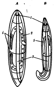 Рис. 20.12. Организация круглых червей. А— самка; Б— самец: 1 — нервная система, 2 — матка, 3— кишечник, 4 — яичники, 5 — семенник