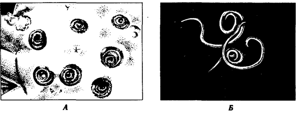 Рис. 20.19. Личинка Anisakis sp. A — в печени рыбы; Б — из желудка человека Гельминты из р. Anisakis— возбудители анизакиаза. Паразитируют в желудке китообразных. Биогельминты. Промежуточными хозяевами их являются морские планктонные рачки, кальмары и рыбы, в мышцах и особенно печени которых инкапсулируются спирально скрученные личинки (рис. 20.19, А). Человек заражается, проглатывая личинок с недостаточно термически обработанными или сырыми морскими рыбными продуктами. Личинки у человека гибнут вскоре после проникновения их через стенку желудка. Патогенное действие связано с нарушением целостности стенки желудка, что сопровождается сильными болями и явлениями гастрита. Возможны перфорации желудка и перитонит, заканчивающийся смертью больного. Заболевание распространено в странах Дальневосточного региона, особенно широко известно в Японии, где морские продукты обычно употребляют в пищу в сыром виде. Диагноз ставится при гастроскопии, когда обнаруживают личинок, внедрившихся в слизистую оболочку желудка (рис. 20.19, Б). Профилактика анизакиаза — санитарный контроль морских продуктов, их термическая обработка при приготовлении пищи.