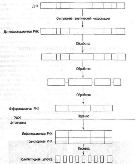 Рис. 3.4. Этапы синтеза протеинов ной цепью; когда рибосома достигает конца, полипептидная цепь является законченной и освобождается. Некоторые протеины состоят из одной полипептидной цепи; сложные протеины состоят из нескольких таких цепей. Некоторые рибосомы прикрепляются к стенкам эндоплазматического ретику-лума (рис. 3.4). Если одна из них выполняет перевод, полипептидная цепь входит в эндоплазматический ретикулум для дальнейшей обработки, например, чтобы соединиться с другими полипептидными цепями для производства некоего сложного протеина. Химическая структура также может изменяться; все зависит от того, какой протеин синтезируется. Отсюда протеины «упаковываются» и посылаются в аппарат Гольджи для дальнейшей обработки и постепенной секреции ■J -|2 Часть I. Начало через клеточную мембрану. Другие рибосомы в свободном состоянии находятся в цитоплазме; если одна из них совершает перевод, полипептидная цепь обычно немедленно активируется в виде протеина и остается внутри клетки. Таким образом, используются всего лишь четыре нуклеотида, составляющих ДНК всех живых существ, чтобы произвести миллиарды потенциально возможных комбинаций 20 главных аминокислот, т. е. миллиарды различных протеинов. Как мы уже говорили, у человека были идентифицированы более 200 тысяч протеинов. Date: 2015-05-08; view: 564; Нарушение авторских прав |