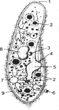 Рис. 14. Схема строения Инфузории-туфельки 1 – реснички; 2 – пищеварительные вакуоли; 3 – макронуклеус; 4 – ротовое отверстие; 5 – клеточная глотка; 6 – порошица; 7 – сократительная вакуоль (центральный резервуар и радиально расположенные приводящие каналы); 8 – макронуклеус; 9 – трихоцисты. Класс Споровики Только паразиты. Малярийный плазмодий поражает эритроциты, печень. У него нет вакуолей (пищеварительных и сократительных). Питание, дыхание, выделение – всей поверхностью тела. Основной хозяин – самки малярийного комара. Промежуточный – человек. Date: 2015-04-23; view: 1017; Нарушение авторских прав |