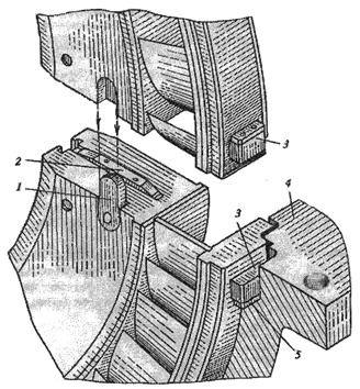 Рисунок 47 - Фиксация половин диафрагмы: 1 – вертикальная шпонка; 2 – радиальная шпонка; 3 – опорные лапки; 4 – обойма; 5 – регулировочные прокладки