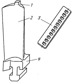 Рисунок 49 - Конструкция простейшей лопатки: 1 – шип; 2 – рабочая часть (перо); 3 – бандажная лента; 4 – хвостовик