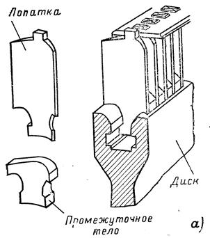 Рисунок 50 - Крепление рабочих лопаток активного (а) и реактивного (б) типа, выполняемых отдельно от промежуточного тела
