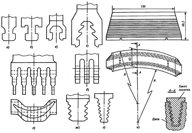 Рисунок 51 - Хвостовики рабочих лопаток: а – Т-образный; б – Т-образный с буртиками; в – грибовидный одноопорный; г - грибовидный трехопорный; д - вильчатый; е - вильчатый ступенчатого типа; ж – зубчиковый; з – елочный торцевой; и - елочный торцевой с круговой заводкой
