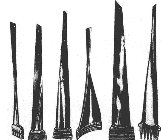 Проволочные (и демпферные) связи ухудшают экономичность ступени, создавая дополнительное сопротивление, отклоняя поток. Отверстие в лопатке обычно требует в этом сечении утолщения профиля, чтобы компенсировать уменьшение его площади. Рабочие лопатки паровых турбин для большинства ступеней изготавливаются из нержавеющих сталей, содержащих примерно 13% хрома. В первых ступенях турбин, рассчитанных на очень высокую температуру, для лопаток используются особые жаропрочные стали, иногда даже аустенитного класса. ЛМЗ имеет большой опыт по использованию лопаток для последних ступеней из титанового сплава, обладающего высокой удельной прочностью. На рис.53 представлены лопатки последних ступеней мощных паровых турбин. Технология изготовления рабочих лопаток разнообразна: в зависимости от формы лопатки и оборудования на заводах применяются штамповка, фрезерование (прямое или косое), копирование на строгальных и фрезерных станках, электрохимическая обработка, прецизионная штамповка. Последняя применяется практически для всех высот лопаток, так как требует незначительных доводочных операций. Изготовление длинных лопаток, особенно переменного сечения и с большой веерностью, требует больших трудозатрат при производстве по сравнению с лопатками постоянного профиля по высоте.