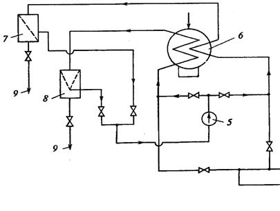 Рисунок 94 - Схема системы для поддержания чистоты конденсатора эластичными шариками: 1 – циркуляционный насос; 2 – фильтр очистки воды; 3 – электродвигатель, вращающий колесо фильтра; 4 – подача обратного потока воды для очистки сетки фильтра; 5 – насос-дозатор подачи шариков в циркуляционную систему; 6 – конденсатор с основным и встроенным трубными пучками; 7, 8 – решетки, улавливающие шарики; 9- слив охлаждающей воды; 10 – отвод загрязнений