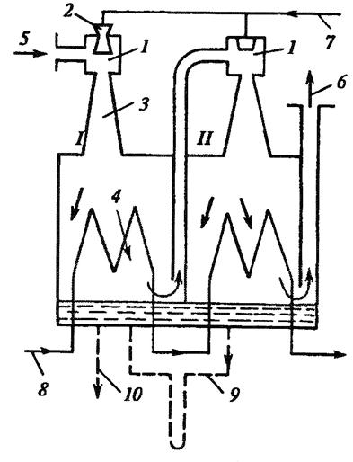 Рисунок 96 - Принципиальная схема двухступенчатого пароструйного эжектора: I, II – первая и вторая ступени эжектора; 1 – приемные камеры; 2 – сопло; 3 – диффузор; 4 – холодильник; 5 - вход паровоздушной смеси; 6 – выхлоп эжектора; 7 – подвод рабочего пара; 8 – вход охлаждающей воды; 9 – сброс дренажа; 10 – отвод дренажа в конденсатор