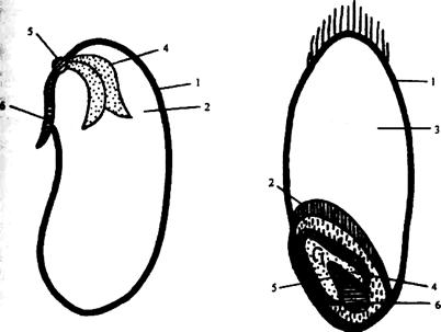 двудольное однодольное Рис. 21. Схема строения семени 1 – кожура; 2 – семядоля; 3 – эндосперм; 4 – почечка; 5 – стебелек; 6 – корешок. Условия прорастания семян: живой зародыш, температура от +10°С до +30°С, наличие влаги, доступ кислорода. Первым из семени при разрыве семенной кожуры появляется зародышевый корешок. Он закрепляется в почве и обеспечивает зародыш водой и минеральными веществами. Затем начинает расти зародышевый стебелек, который выносит из почвы почечку и семядоли (надземное прорастание семян – фасоль, тыква). Если семядоли не выносятся на поверхность почвы, то прорастание семян подземное – горох, дуб, пшеница. Молодое растение, образующееся из зародыша семени, называется проростком. В начале развития проросток питается за счет питательных веществ, запасенных в семени, а с появлением первых листьев он переходит на самостоятельное фототрофное питание. Date: 2015-04-23; view: 2740; Нарушение авторских прав |