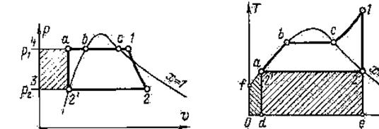 Рис. 6. Цикл Ренкина для перегретого пара в р- ϑ и Т- s-диаграмме. Изобразим цикл Ренкина в координатах Т, s, как это показано на рис. 6. Здесь точка а совмещена с точкой 2', так как при сжатии воды в насосе ее температура и энтропия практически не изменяются, а изобара подогрева воды совпадает с нижней пограничной кривой. В этой диаграмме отдельные площади изображают: пл. Ofabc1e — энтальпию перегретое пара ii состояния 1; пл. Оf2'2е — энтальпию отработавшего пара состояния 2 при входе в конденсатор i2; пл. O\2'd — энтальпию конденсата состояния 2' после конденсатора i'. Теплота q1 сообщенная 1 кг пара в парогенераторе по изобаре а — Ь — с — 1, изображается пл. dabcle и определяется по уравнению: