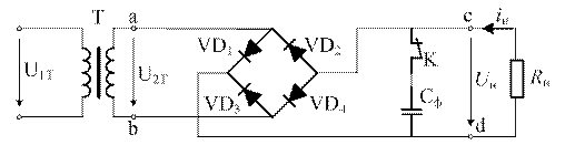 В этом выпрямителе блок вентилей состоит из четырёх диодов, включённых по мостовой схеме. На одну диагональ мостовой схемы подаётся синусоидальное напряжение U2Т от вторичной обмотки трансформатора Т. Ко второй диагонали подключаются нагрузка RH и фильтр СФ. Данный выпрямитель может работать как без фильтра (когда ключ K разомкнут), так и с фильтром.