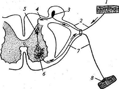 Рис. 31. Рефлекторная дуга 1– рецептор, 2 – дендрит чувствительного нейрона, 3 – его тело, 4 – его аксон, 5 – вставочный нейрон, 6 – тело двигательного нейрона, 7 – его аксон, 8 – рабочий орган. Звенья рефлекторной дуги соматической нервной системы: 1. Рецептор, который воспринимает раздражение и преобразует его в нервный импульс. 2. Чувствительный (центростремительный) нейрон передает возбуждение в центральную нервную систему (ЦНС). 3. Нервный центр – участок ЦНС, где происходит переключение возбуждения с чувствительных нейронов на двигательные. 4. Двигательный (центробежный нейрон) несет возбуждение от ЦНС к рабочему органу. 5. Рабочий орган – поперечнополосатые мышцы, реагирующие на полученное раздражение. Нервная система анатомически подразделяется на центральную и периферическую. Центральная нервная система включает головной и спинной мозг. К периферической относят: нервные корешки, узлы, сплетения, нервы и нервные окончания. ЦНС регулирует все процессы организма и служит центром управления всеми системами организма человека. Головной и спинной мозг покрыт тремя мозговыми оболочками, образованными соединительной тканью. 1. Твердая – наружная оболочка, образованная плотной волокнистой соединительной тканью. 2. Паутинная – средняя оболочка, содержащая кровеносные сосуды и нервы. 3. Мягкая (сосудистая) – внутренняя оболочка, прилежит непосредственно к мозгу, содержит большое количество кровеносных сосудов. Между паутинной и сосудистой оболочками находится пространство, заполненное спинномозговой жидкостью. Мозговые оболочки выполняют следующие функции: 1) защищают мозг от повреждений; 2) препятствуют проникновению микробов в мозг; 3) участвуют в секреции спинномозговой жидкости, обеспечивающей транспорт веществ ко всем отделам мозга и удаление продуктов обмена. Спинной мозг – цилиндрический тяж диаметром около 1 см и длиной 41–45 см, находящийся в костном позвоночном канале. Спинной мозг вверху переходит в продолговатый мозг, а внизу оканчивается коническим заострением на уровне второго поясничного позвонка. Спинной мозг на своем протяжении имеет два утолщения – шейное и поясничное – от которых отходят нервы к верхним и нижним конечностям. Передней и задней продольными бороздами он делится на две симметричные половины. На той и другой стороне из спинного мозга выходят двумя продольными рядами передние (двигательные) и задние (чувствительные) корешки. Передний корешок состоит из аксонов двигательных нейронов, лежащих в передних рогах серого вещества. Задний корешок содержит отростки чувствительных нейронов, тела которых лежат в спинномозговых узлах. На некотором расстоянии от спинного мозга двигательный корешок соединяется с чувствительным, и они вместе образуют смешанный спинномозговой нерв. У человека 31 пара спинномозговых нервов. Соответственно выходу из спинного мозга нервов, спинной мозг делится на 31 сегмент. Внутреннее строение. В центре спинного мозга находится серое вещество. Внутри серого вещества, по всей его длине, проходит узкий центральный канал, заполненный спинномозговой жидкостью. Вверху он сообщается с полостью четвертого желудочка головного мозга. В сером веществе различают передние, задние, а в грудном отделе также и боковые рога. В передних рогах серого вещества находятся тела двигател