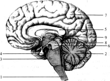 Рис. 32. Поперечный разрез головного мозга 1 – продолговатый мозг; 2 – мозжечок; 3 – мост; 4 – гипофиз; 5 – мозолистое тело; 6 – средний мозг (ножки мозга); 7 – полушария переднего мозга; 8 – средний мозг (бугорки четверохолмия); 9 – промежуточный мозг.