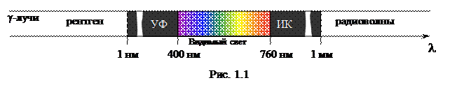 Видимый свет – это электромагнитное излучение с длинами волн приблизительно от 400 до 760 нм (от фиолетового до красного) (1 нм = 10–9 м; нм – обозначение нанометра – единицы измерения малых длин). Если расположить области электромагнитного спектра в порядке увеличения длины волны (рис. 1), то слева от видимого диапазона будет область ультрафиолетового (УФ) излучения (l<380 нм), а справа – область инфракрасного (ИК) излучения (l >760 нм).