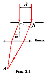 Дифракционный спектр в этой работе вы будете получать с помощью дифракционной решётки. Она представляет собой совокупность узких параллельных щелей, пропускающих свет, разделённых непрозрачными полосами. Каждая щель усиливает действие соседней, и картина получается существенно более яркой, чем от одной щели. Основной характеристикой дифракционной решётки является постоянная решётки d – суммарная ширина прозрачной и непрозрачной полоски (рис.2.1). Эту величину называют также периодом дифракционной решётки. На рисунке из всех лучей, упавших на решётку, выделены два луча, прошедшие через неё на расстоянии d друг от друга. Эти лучи испытали дифракцию, т.е. отклонились от прямого пути на угол α. Поставленная на их пути линза собрала их в своём фокусе, где они наложились друг на друга. Результат наложения определяется той разностью хода Δ, которую они приобрели из-за отклонения от прямого пути. В точке А экрана будет наблюдаться максимум для длины волны l, если разность хода этих волн кратна целому числу длин волн:
