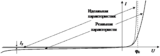 Умножив плотность тока на площадь p-n-перехода S получим ток через диод: I = Is При U > 0 ток экспоненциально растет с ростом напряжения, при U < 0 Формула (1.16) описывает ВАХ идеализированного p-n-перехода. В реальных диодах напряжение падает не только на ОПЗ, но и на слаболегированной области диода – базе: