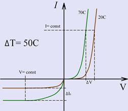 Для Si Eg0 = 1,17 эВ, a = -3,9 ∙ 10-4 эВ/К, для Ge Eg0 = 0,785 эВ, a = -3,7 ∙ 10-4 эВ/К, для GaAs Eg0 = 1,52 эВ, a = -4,3 ∙ 10-4 эВ/К. Это приводит к росту тока насыщения (рисунок 2.1),