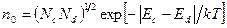 При низкой температуре (область 1) концентрация носителей повышается с ростом температуры за счет ионизации атомов примеси. Концентрацию свободных носителей заряда в области 1, называемой областью слабой ионизации примеси, можно оценить по формуле (2.4), если полупроводник легирован донорной примесью (n-тип проводимости), или по формуле (2.5), если полупроводник легирован акцепторной примесью (p-тип проводимости).