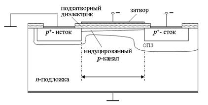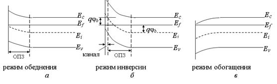 В МДП-транзисторе со встроенным каналом между стоком и истоком создана область с тем же типом проводимости – канал, сопротивление которого меняется при приложении напряжения к затвору. Это нормально открытый прибор (ток между стоком и истоком может протекать при нуле на затворе). Наиболее широко используются МДП-транзисторы с индуцированным каналом. На них построены почти все современные интегральные схемы. Мы будем рассматривать МДП-транзистор с индуцированным p-каналом (рисунок 6. 2). В полупроводнике n-типа созданы сильнолегированные области p-типа – исток и сток (расстояние между ними – длина канала L). Над областью образования канала расположен затвор, отделенный от полупроводника диэлектриком. (В кремниевых транзисторах в качестве диэлектрика используют обычно оксид кремния SiO2, в этом случае прибор называют МОП-транзистором). При нулевом смещении на затворе ток между стоком и истоком будет равен току обратно смещенного p-n-перехода сток – подложка. Если на затвор подан отрицательный потенциал, электроны под действием электрического поля оттесняются от поверхности, а дырки – притягиваются. Таким образом, происходит смена проводимости приповерхностного слоя с n-типа на p-тип – инверсия типа проводимости. Между истоком и стоком возникает канал с тем же типом основных носителей, и при приложении напряжения Uси будет течь ток Iс. Напряжение на затворе Uзи, при котором меняется тип электропроводности полупроводника под затвором, называют пороговым Uпор. Энергетические зонные диаграммы полупроводника под затвором МДП-структуры приведены на рисунке 6.3. При отрицательном смещении на затворе энергетические зоны будут искривляться вверх тем сильнее, чем выше смещение.