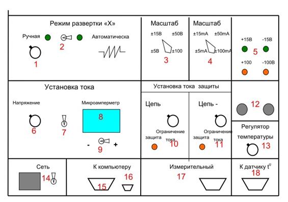1. Потенциометр установки напряжения на выходе канала напряжения (±100 В). Действует только в режиме ручной развертки. 2. Тумблер выбора режима развертки. В левом положении тумблера включается режим ручной развертки, в правом положении – автоматической развертки. Текущий режим индицируют светодиоды. В среднем положении тумблера развертка отключена. 3. Галетный переключатель управления программируемым усилителем канала напряжения. Задает амплитуду напряжения на выходе высоковольтного напряжения. Следует помнить, что при положении переключателя более ±15В напряжение на выходе канала напряжения может быть опасно для жизни. 4. Галетный переключатель управления программируемым усилителем канала тока. Задает масштаб усиления канала тока. 5. Панель блока питания индицируют контрольные напряжения блока питания. Следует помнить, что какие-либо манипуляции с измерительным щупом разрешаются только при отключении питания установки (тумблер 15) после полного прекращения свечения индикаторов «+100В» и «-100В». 6. Потенциометр установки смещения управляющего электрода исследуемых образцов. В случае изучения биполярных транзисторов потенциометр устанавливает ток базы. 7. Тумблер включения питания микроамперметра тока смещения. С целью снижения влияния сетевых помех питание прецизионного микроамперметра осуществляется от литиевой батареи, установленной на задней панели измерительного блока. Емкости литиевой батареи обеспечивает минимум один год непрерывной работы микроамперметра. 8. Прецизионный микроамперметр индицирующий значение тока (0-10 мA) смещения управляющего электрода. 9. Тумблер полярности включения микроамперметра. В левом положении тумблера устанавливается отрицательная полярность микроамперметра, в правом положении соответственно положительная полярность. 10. Регулятор установки динамического ограничения тока. Определяет максимальный ток, протекающий в положительной цепи питания (+100В) высоковольтного усилителя. Режим ограничения тока индицируется светодиодом «защита». 11. Регулятор установки динамического ограничения тока. Определяет максимальный ток, протекающий в положительной цепи питания (-100В) высоковольтного усилителя. Режим ограничения тока индицируется светодиодом «защита». 12. Контакты силовой цепи управления внешнего нагревателя. При включенном электропитании измерительного блока не рекомендуется осуществлять коммутацию контактов нагревателя, поскольку его рабочее напряжение составляет 220 В. 13. Потенциометр установки температуры. Осуществляет управление автоматической системой управления нагревателя. 14. Панель подключения сети питания. 15. COM- интерфейс компьютера. Обозначение разъема – Р1. Внимание! Несмотря на то, что в разъемах Р1, Р2, Р3 задействованы различные группы контактов, высокое напряжение, достигающее 100 В на контактах разъема Р2 измерительного щупа в следствии утечки при ошибочном подключение СОМ – порта компьютера к разъему измерительного щупа P2 может повредить компьютер. 16. USB – интерфейс компьютера. Обозначение разъема – Р1. 17. Разъем P2 подключения измерительного щупа. Внимание! На контактах разъема может присутствовать напряжение до 100 В. 18. Разъем Р3 подключения датчика температуры нагревательного элемента. Внимание! Ошибочное подключение датчика температуры к разъему измер
