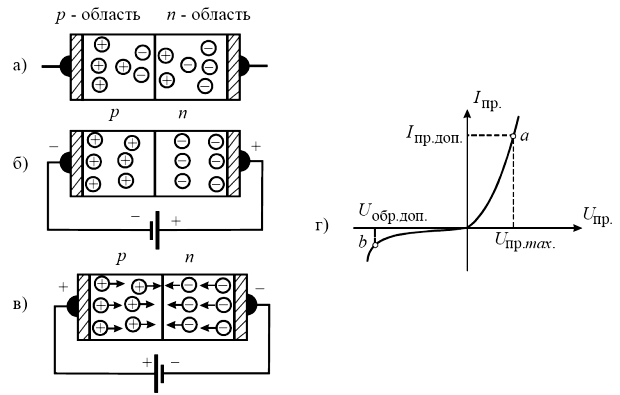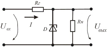Рисунок 1.1 – Полупроводниковые диоды и их характеристики Эта область как бы разрывает цепь, и ток в этой цепи отсутствует. Такая полярность напряжения называется запирающей или обратной и соответствует закрытому состоянию диода (рисунок 1.1,б). Противоположная полярность напряжения перемещает носители навстречу друг другу, и происходит переход (инжекция) носителей в «чужую» область. В результате во внешней цепи появляется ток. Такая полярность напряжения называется прямой или отпирающей и соответствует открытому диоду (рисунок 1.1,в). Типичная вольтамперная характеристика полупроводникового диода изображена на рисунке 1.1,г. Здесь ветвь 0 а соответствует проводящему (прямому) направлению, а ветвь 0 b – непроводящему (обратному). В прямом направлении диод характеризуют допустимым током I пр.доп. и соответствующим ему падением напряжения на диоде U пр.max. В обратном направлении диод характеризуют допустимым значением напряжения U обр.max, которое может быть приложено к диоду. Наличие у диода критического обратного напряжения, при котором наступает электрический (не тепловой) пробой, позволяет использовать полупроводниковый диод в схемах стабилизации напряжения. Одна из возможных схем стабилизации представлена на рисунке 1.2. Выходное напряжение схемы с большой точностью поддерживается на заданном уровне U вых=const, равном критическому (пробивному) напряжению диода. Разница между входным и выходным напряжениями гасится на сопротивлении R Г. Если входное напряжение возрастает, то увеличивается и обратный ток диода, возрастает ток I и падение напряжения на гасящем сопротивлении R Г. Приращения напряжений U вх и Δ I · R Г взаимно компенсируются, а U вых сохраняется на заданном уровне. Диод, используемый для стабилизации напряжения, называется стабилитроном. Недостаток данной схемы – зависимость пробивного напряжения стабилитрона, а, следовательно, и выходного напряжения U вых от температуры. Эту зависимость можно существенно уменьшить, включив последовательно со стабилитроном компенсирующий диод в прямом направлении.