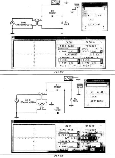 Лабораторная работа № 10 Однополупериодные и двухполупериодные выпрямители Цель работы 1. Анализ процессов в схемах однополупериодного и двухполупериодного выпрямителей. 2. Сравнение форм входного и выходного напряжения для однополупериодного и двухполупериодного выпрямителей. 3. Определение среднего значения выходного напряжения (постоянной составляющей) в схемах однополупериодного и двухполупериодного выпрямителей. 4. Определение частоты выходного сигнала в схемах однополупериодного выпрямителя и двухполупериодного выпрямителя с выводом средней точки трансформатора. 5. Сравнение максимальных значений выходного напряжения для схем двухполупериодного и однополупериодного выпрямителей. 6. Сравнение частот выходного сигнала для схем двухполупериодного и однополупериодного выпрямителей. 7. Анализ обратного напряжения Umax на диоде в схемах однополупериодного и двухполупериодного выпрямителей. 8. Исследование работы трансформатора в схеме выпрямителя. Приборы и элементы