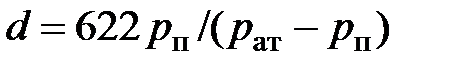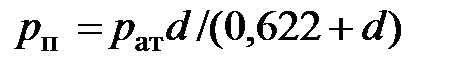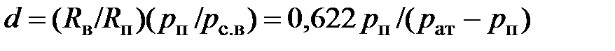 где Обычно влажный воздух имеет низкое давление (атмосферное), а парциальное давление водяного пара во влажном воздухе ещё меньше (таблица Д.1). Вследствие этого свойства его мало отличаются от идеального газа. Поэтому к влажному воздуху применимы уравнения состояния идеального газа, а для паровоздушных смесей можно применять уравнения для идеальных газовых смесей (см. ЛР 1). В соответствии с законом Дальтона давление влажного воздуха (как правило, атмосферное) равно сумме парциальных давлений сухого воздуха и водяного пара