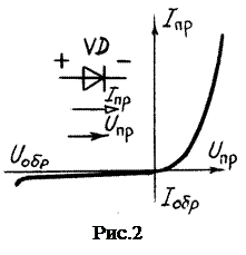 Диодом называют полупроводниковый прибор с одним n - p -переходом и двумя внешними выводами. По назначению диоды делят на выпрямительные, высокочастотные, импульсные, стабилитроны и т.д. Их изготавливают на основе германия или кремния. Выпрямительные диоды предназначены для преобразования переменного тока низкой частоты в постоянный ток. Вольтамперная характеристика (ВАХ) выпрямительного диода, его условное графическое изображение и буквенное обозначение даны на рис. 2 Основные параметры выпрямительного диода: предельно допустимый постоянный ток диода I пр.max и максимально допустимое обратное напряжение U обр.max.