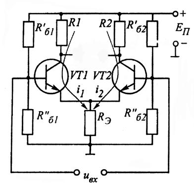В настоящее время, особенно при разработке интегральных схем, широкое распространение получили дифференциальные усилители дифференциальные, т.е. разностными называются усилительный каскад, усиливающий разность двух напряжений. По принципу построения это балансные мостовые усилительные каскады параллельного типа. Они обладают высокой стабильностью параметров при воздействии различных дестабилизирующих факторов, большим коэффициентом усиления. По структуре такой усилитель состоит из 2 каскадов, у которых используется общий эмиттерный резистор (рис.1).