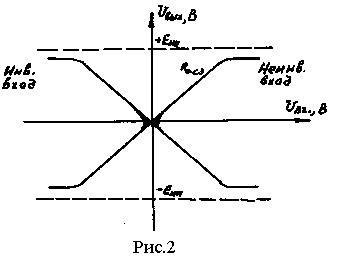 Важнейшими характеристиками ОУ являются амплитудные (передаточные) Uвых=f(Uвх) (рис.2) и амплитудно-частотные (АЧХ) к u=ƒ (f). Последние имеют вид АЧХ усилителя постоянного тока за исключением специальных частотнозависимых устройств (избирательный усилитель и др.). Передаточные характеристики имеют линейный участок, для которого к U=