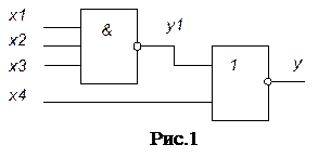 Любая сложная логическая функция может быть реализована с помощью ЛЭ, выполняющих элементарные функции И-НЕ, ИЛИ-НЕ. Пусть требуется составить комбинационную схему с четырьмя входами x 1, x 2, x 3, x 4 и одним выходом y. Высокий уровень напряжения должен появляться на выходе только при наличии высоких уровней на трех входах, т.е. y =1 при x 1= x 2= x 3=1 и x 4=0. Такую схему можно составить путем подбора элементов. Например, элемент 3И-НЕ при подаче на его входы x 1= x 2= x 3=1 дает на выходе сигнал y 1=0. Подавая его и x 4=0 на вход элемента 2ИЛИ-НЕ, получаем y =1(рис.1).