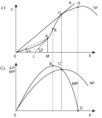 Рис. 1. а) кривая общего продукта (TP); б) кривые среднего продукта (АР) и предельного продукта (MP)