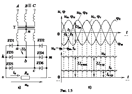 Направление токов в R н остается одинаковым, а выпрямленное напряжение u н является разностью потенциалов точек k и m и определяется огибающими диаграммы uа, ub, uс (рис. 1.5, б). Напряжение u н имеет малую пульсацию p = 0,057, его постоянная составляющая