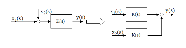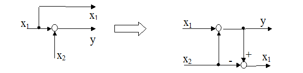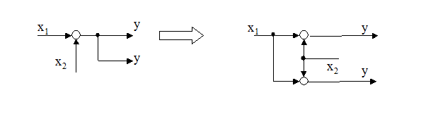 При структурных преобразованиях бывает необходимо поменять местами узлы суммирования или точки ветвления, либо перенести какую-то из этих точек через звено. Идея заключается в том, чтобы при таких преобразованиях не изменились входные и выходные сигналы.