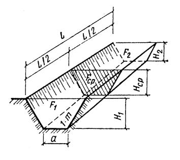 Для розрахунку об’ємів траншей і лінійно-протяжних споруд необхідно подати поздовжні й поперечні профілі. Поздовжній профіль розділяють на ділянки відповідно з точками перелому по поверхні ґрунту і дну траншей. Об’єм траншеї на кожній ділянці визначають окремо, а потім їх підсумовують. На рис.3.2 наведена траншея, що являє собою трапецеїдальний призматоїд. Об’єм такої фігури між пунктами 1 і 2 наближено визначають: V1-2 = (F1+F2)L1-2 (із завищенням) або V1-2 = FСР·L1-2 (із заниженням), де F1, F2 – площі поперечного перерізу в пункті 1 і 2 відповідно, що визначають як F = аН + H2m; FСР – площа поперечного перерізу на середині між пунктами.