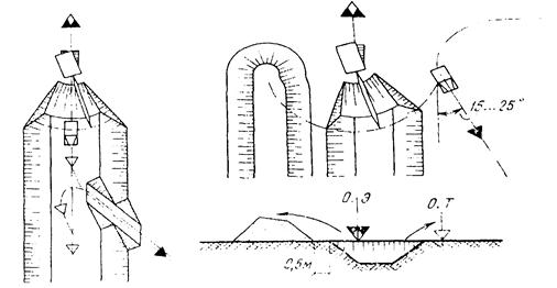 Бічна проходка передбачає розробку ґрунту по одну сторону від осі руху екскаватора (із зворотною лопатою). Найбільш доцільно застосовувати екскаватор із зворотною лопатою для розробки траншей глибиною до 6 м і невеликих котлованів глибиною до 4 м (наприклад, під фундаменти окремих колон). Для торцевої і бічної проходок організація робіт драглайна і зворотної лопати аналогічна. При цьому зберігається таке ж співвідношення максимальної глибини різання. Драглайн пересувається між черговими стоянками на 1/5 довжини стріли, тому що його ківш підвішений до стріли гнучко. Для нього ефективною є човникова схема роботи (рис.3.7). У цій схемі передбачено, що автосамоскид підходить до місця завантаження по дну забою і завантажується поперемінними черпаннями ковша з обох сторін кузова. Кут повороту екскаватора при навантаженні за поздовжньо-човниковою схемою наближається до 00, а при поперечно-човниковій – до 15...200, при цьому тривалість розвантаження зменшується, тому що ківш випорожняється без припинення поворотного руху екскаватора в момент переносу ковша над кузовом машини. Завдяки цьому загальна тривалість робочого циклу екскаватора ТЦ знижується на 20...26%. При розробці ґрунтів екскаватор, обладнаний грейферним ковшем, повинен бути так розташований щодо траншеї, щоб кут його повороту не перевищував 70...900. Грейфер на нову стоянку пересувається на 1/4 довжини стріли.