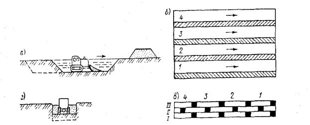 У неглибоких виїмках розробку ґрунту ведуть пошарово (до 30 см), у широких і на майданчиках застосовують кілька технологічних схем, що забезпечують найбільшу продуктивність бульдозерів. При відсипанні ґрунту, який розроблюють пошарово, з переміщенням його з котловану чи резерву до відвалу, кавальєру або безпосередньо до насипу більш раціональною є поперечна схема з ярусно-траншейною розробкою (рис.3.12, а - в). Суть цієї технології полягає в тому, що кожен наступний прохід бульдозера в межах одного ярусу виконується зі зміщенням уздовж виробки на відстань, що перевищує ширину відвалу на 0,4-0,6 м. У результаті між суміжними проходками залишаються вертикальні стінки, що перешкоджають висипанню ґрунту за межі призми волочіння. У другу чергу виконується зрізання вертикальних стінок. У випадку влаштування вузьких виїмок і траншей (рис.3.12, г) найбільш раціональною є поздовжня схема розробки ґрунту на всю глибину. За цією схемою роботу здійснюють захватками довжиною не більше 50 м. Якщо відстань переміщення ґрунту перевищує 50 м, то незалежно від напрямку ходу бульдозера щодо осі виробки застосовують схему, що передбачає влаштування проміжних валів. З метою зниження непродуктивних втрат ґрунту на шляху його переміщення в насип або відвал застосовують бригадну форму організації декількох бульдозерів, розташовуваних уздовж виробки уступом. При цьому величина бічного зміщення кожного наступного бульдозера щодо попереднього повинна складати 0,7...0,8 ширини відвалу. Ґрунт краще переміщати по природній поверхні, а не по порушеній, що знижує затрати енергії. Розробка ґрунту скреперами. Скрепери належать до найбільш високопродуктивних землерийно-транспортних машин. Їх застосовують для влаштування лінійно-протяжних земляних споруд (виїмок і насипів доріг, каналів, дамб і т.п.), а також планування площадок різного призначення і розробки неглибоких котлованів.