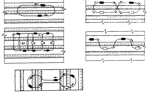 Рис.3.14 – Схеми розробки ґрунту скреперами: а – еліпсною; б – вісімкою; в – по спіралі; г – по зиґзаґу; д – поперечно-човниковою