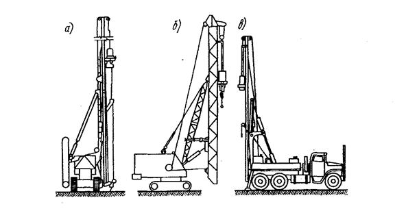 Ударний спосіб занурення є найбільш розповсюдженим, що обумовлено ефективністю застосовуваного обладнання. Для занурення паль використовують різні молоти: механічні, паро-повітряні й дизель-молоти. Такі механізми встановлюють на копрових установках різної конструкції. За способом пересування розрізняють палебійні установки на рейковому шляху і мобільні, які відзначаються тим, що як базову машину використовують екскаватор, трактор і автомобіль. Схеми самохідних палебійних установок наведені на рис.4.1. Ударним способом занурюють, широко застосовуючи дизель-молоти. За конструктивним виконанням їх розділяють на штангові й трубчасті. До більш ефективного способу слід віднести трубчасті, що обумовлено енергією удару, який у 2,5 раза більше ніж у штангових. Вибір устаткування залежить від співвідношення маси молота і палі, а також виду ґрунту, в який занурюють палю.