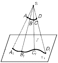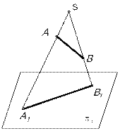 Проекцией фигуры называют множество проекций всех ее точек. Проекция криволинейной фигуры представляет собой линию пересечения проецирующей поверхности Свойства центрального проецирования: Так как через две различные точки можно провести одну и только одну прямую, то при заданном центре проецирования и плоскости проекций, каждая точка пространства будет иметь одну и только одну центральную проекцию.
