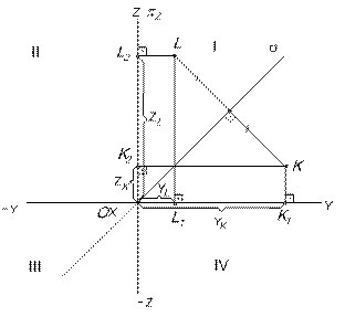 На рис.13 изображен вид А пересекающихся плоскостей Координаты Y и Z точек, лежащих на плоскости симметрии одинаковы по величине и по знаку: Уа = ZА; -УС = ZС. Координаты Y и Z точек, лежащих на плоскости тождества одинаковы по величине, но противоположны по знаку: -УВ = ZВ; УD = - ZD 1.6. ТОЧКИ, СИММЕТРИЧНЫЕ ОТНОСИТЕЛЬНО БИССЕКТОРНЫХ ПЛОСКОСТЕЙ. Пусть точка L симметрична точке К относительно s (рис.14). Тогда координата YК равна по величине и по знаку координате ZL (YК = ZL), а координата ZК равна по величине и по знаку координате YL (ZК = YL). Координаты Y и Z точек, симметричных относительно плоскости симметрии, равны по величине и по знаку координатам Z и Y заданных точек. Пусть точка М симметрична точке К относительно плоскости тождества