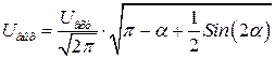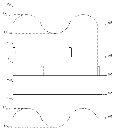 Система управления формирует в необходимые моменты времени импульсы для включения тиристоров. Через iy1 и iy2 обозначены токи управляющих электродов. В силовой электронике используется понятие угла управления. Углом управления называют угол сдвига по фазе между началом каждой положительной полуволны входного напряжения и соответствующим моментом включения тиристора Т1, а также равный ему угол сдвига по фазе между началом каждой отрицательной полуволны и соответствующим моментом включения тиристора Т2. Пусть угол управления a равен нулю. Т.к. a =0. то в каждый момент времени один из тиристоров будет включен и напряжение ит будет практически нулевым (напряжение на включенном тиристоре составляет примерно 1 В). Поэтому напряжение на нагрузке будет повторять входное напряжение (рис. 11.5). Пусть a =90 электрических градусов. В этом случае (рис. 11.6) действующее напряжение на нагрузке будет пониженным. При a =180 электрических градусов напряжение на выходе будет нулевым. Действующее напряжение Uвых напряжение на выходе при изменении угла управления в радианах для 0£ a £p определяется выражением: