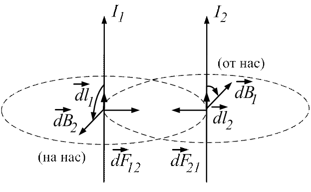 По закону Био – Савара – Лапласа на проводник I2 действует магнитное поле, созданное I1. На проводник I1 действует магнитное поле со стороны тока I2. По закону Ампера на проводник с током в магнитном поле действует сила Ампера